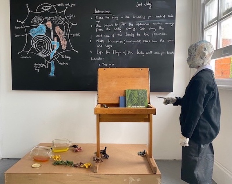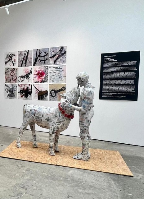 SUSAN ASKEW (alisases – Nasus Y Ram and Weksa Nosmada) was born and grew up on a farm in North Yorkshire and can trace animal farming on both sides of her family for generations. This experience influenced her to focus on violence to the farmed animal in her work. She takes a hopeful/utopian radical futurist approach in which future humans look back with incomprehension at their treatment of the farmed nonhuman. The Museum of Human Violence is a central concept in her work. Opened in 2065, the museum houses artefacts from the past, as well as organises events in the future that have the function of both remembering and honouring the victims of past violences, and celebrating peace in 2065: https://themuseumofhumanviolence.com